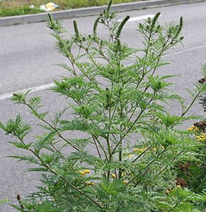 Ambrosia artemisiifolia Synonyms: Ambrosia absynthyfolia, A. elatior , A. heterophylla., A. paniculata., Iva monophylla. English: Ragweed, Bastard wormwood, Carrot weed, Hogweed, Roman wormwood French: Ambroisie German: Traubenkraut Family Compositae Part used: whols plant