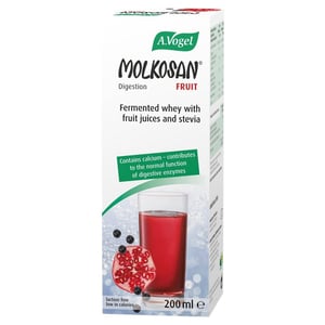 Maintaining the proper balance of gut bacteria helps maintain digestive comfort and a feeling of well-being. Molkosan® Fruit is an alkalinising lacto-fermented whey tonic, full of L+ lactic acid and calcium. Calcium contributes to the normal function of digestive enzymes.