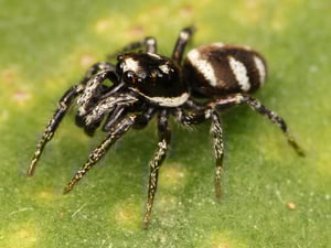 The zebra spider (Salticus scenicus) is a common jumping spider of the Northern Hemisphere. Like other jumping spiders it does not build a web. It has a particularly large pair of forward facing eyes that help it to locate and stalk its prey before pouncing on it. Their common name refers to their vivid black-and-white colouration, whilst their scientific name derives from Salticus from the Latin for “dancing”, in reference to their agility, and the Greek scenicus, translating to “theatrical” or “of a decorative place,” in reference to the flashy, zebra-like coloration of the species.