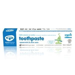 ORGANIC SPEARMINT, PEPPERMINT & ALOE VERA A certified organic children's toothpaste formulated for delicate teeth & gums. Non-toxic if swallowed by babies or children 100% natural - free from SLS and fluoride. Removes plaque and reduces bacterial regrowth. Contains antioxidant Olive Leaf extract which helps to protect gums. No hydrocarbon or aluminium contamination.