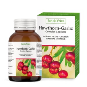 Jan de Vries Hathorn-Garlic Complex Capsules combine organically cultivated garlic who's usefulness has been catalogued back to antiquity, with the pulp of the deep red fruit of the hawthorn. One of the most familiar of hedgerow berries, and the beautiful Passiflora plant.Hawthorn-Garlic Complex Capsules contain vitamin B1, which contributes to the normal function of the heart. They are also a rich source of vitamin E, an antioxidant which can help protect the body from oxidative stress